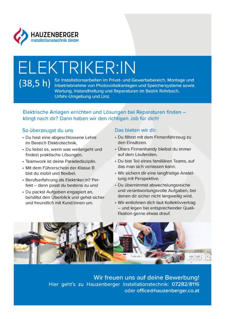 für Installationsarbeiten im Privat- und Gewerbebereich, Montage und Inbetriebnahme von Photovoltaikanlagen und Speichersysteme sowie Wartung, Instandhaltung und Reparaturen in den Bezirken Rohrbach, Urfahr-Umgebung und Linz.