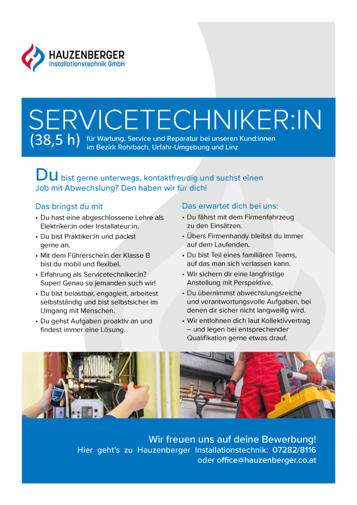 für Wartung, Service und Reparatur bei unseren Kund;innen in den Bezirken Rohrbach, Urfahr-Umgebung und Linz.